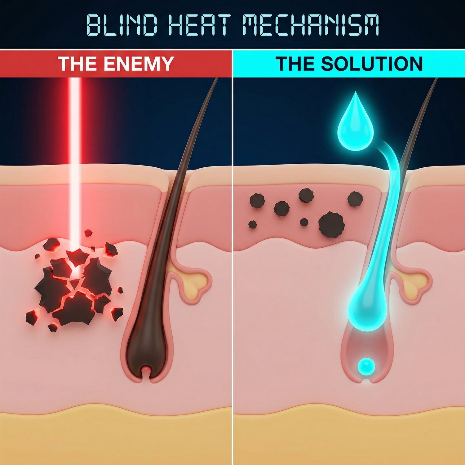 Cyperus Rotundus operates on biology, not light. The active compounds travel down the empty follicle after shaving, bypassing your skin's pigment entirely. It locally blocks the nutrients to the hair root, miniaturizing it over time without ever touching your ink.